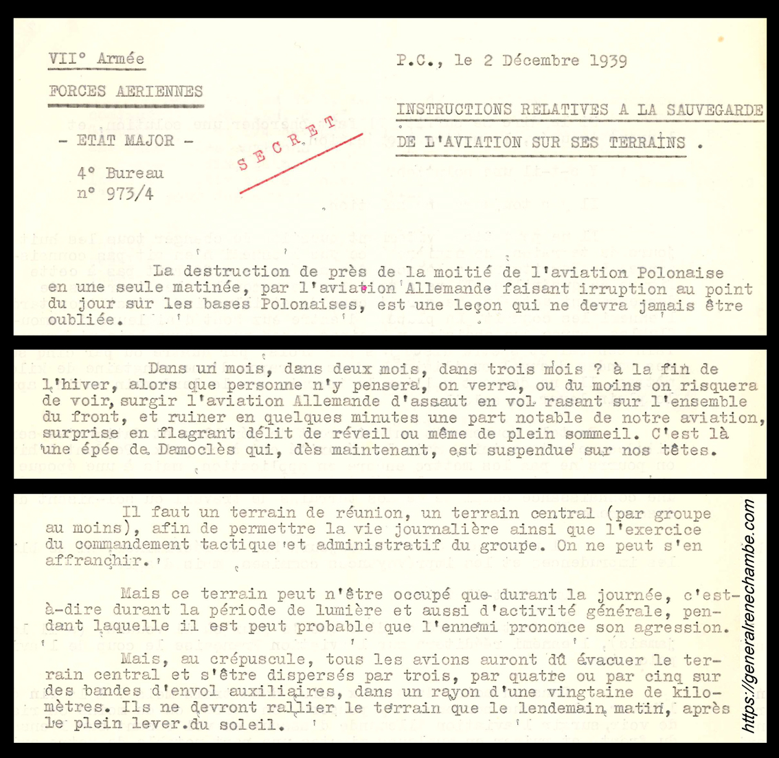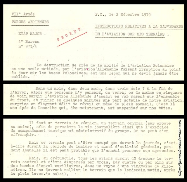 Extraits d’une note de service rédigée par le colonel Chambe le 2 décembre 1939. Il met en garde les unités aériennes qu’il commande (toutes les forces aériennes et anti-aériennes de la VIIe Armée) contre une attaque surprise de l’aviation allemande qui mettrait en grave péril le matériel volant. Il suggère donc de disperser les avions à la tombée de la nuit sur des terrains auxiliaires par 3, 4 ou 5 afin de rendre les unités moins vulnérables. La suite des événements en mai 1940 lui donnera raison. Sur une note manuscrite d’après-guerre, Chambe déplore que les autres unités n’en aient pas fait autant, payant cher cette imprévision. Archive René Chambe.
